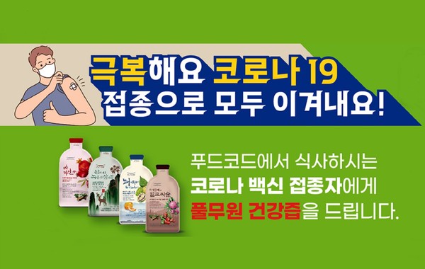 풀무원푸드앤컬처는 코로나19 백신 접종 독려를 위해 코로나19 백신 접종자에게 풀무원녹즙의 건강즙 1봉을 증정한다.