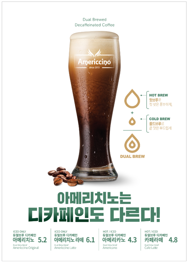신제품은 △듀얼브루의 장점을 모두 느낄 수 있는 '듀얼브루 디카페인 아메리카노' △풍미와 우유가 조화를 이룬 '듀얼브루 디카페인 카페라떼' △시그니처 음료인 아메리치노의 에스프레소 거품과 커피 풍미를 느낄 수 있는 '듀얼브루 디카페인 아메리치노' △아메리치노와 우유가 조화를 이룬 '듀얼브루 디카페인 아메리카노 라떼' 등 4종이다.