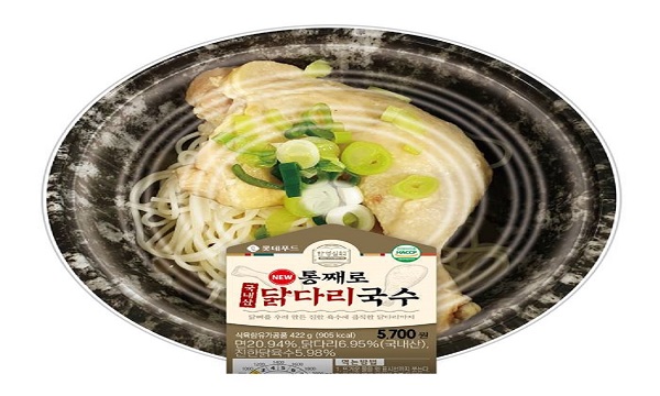 ‘통째로 닭다리국수(5700원)’는 초복을 겨냥해 롯데중앙연구소, 식품영양전문가 한영실 교수 맞춤식품 연구소와 협업해 만든 상품으로 큼지막한 국내산 닭다리 한 마리가 통째로 들어간 보양 간편식이다.