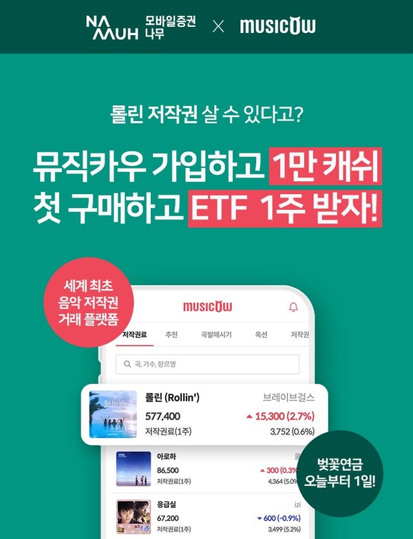 모바일증권 나무 어플리케이션 이벤트 페이지를 통해 뮤직카우 회원 가입 시 선착순 1만 명에게 뮤직카우 1만 캐쉬를 제공하는 이벤트다. 이 이벤트는 7월5일부터 8월3일까지 진행한다.