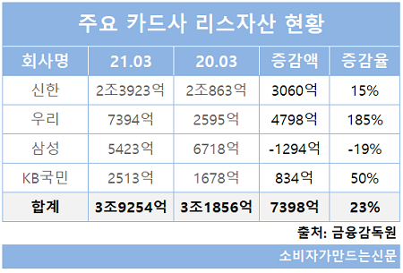 금융감독원에 따르면 올해 1분기 기준 전체 카드사의 리스 자산 규모는 3조9254억 원으로 전년 동기 3조1856억 원 대비 23% 증가했다. 현재 리스업을 영위하는 곳은 신한카드와 삼성카드, KB국민카드, 우리카드 등 4곳이다.