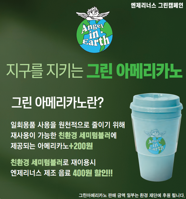 캠페인 참여는 전국 엔제리너스 매장에 방문해 일반 아메리카노 레귤러 사이즈에 200원이 추가된 '그린 아메리카노'를 주문해 재사용이 가능한 친환경 세미 텀블러로 제공받으면 된다. 판매 수익금의 일부는 환경재단(지구쓰담)에 후원금으로 사용된다.