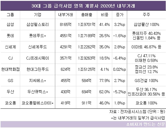 삼성웰스토리와 신세계푸드는 내부거래액이 4000억 원 이상으로 많고 비중도 40% 안팎이다. 30대 그룹 전체 계열사의 내부거래비중 평균인 13%보다 3배가량 높은 수치다.