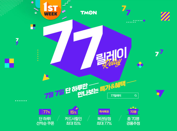 먼저 시간대 별로 할인 쿠폰을 선착순으로 발급한다. 7일 오전 0시, 9시, 11시, 오후 1시, 3시, 5시에 14% 할인 쿠폰이 각각 777장씩, 그리고 77릴레이 테마에 맞게 오전 7시와 오후 7시에는 77% 특별 할인 쿠폰이 각각 77장씩 발급된다.