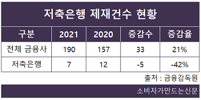 이 가운데 저축은행 제재 건수는 총 7건으로 전년 12건보다 5건(42%) 줄었다. 전체 금융사 제재 건수 중 저축은행이 차지하는 비중도 4%로 전년보다 4%포인트 하락했다.