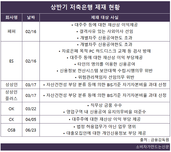 6월 OSB저축은행은 인터넷 쇼핑몰을 운영해 조직적‧계속적으로 상호저축은행법에서 정한 업무가 아닌 업무(전자상거래업)를 영위한 사실이 드러나 제재를 받았다.