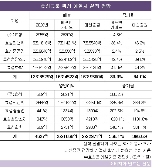 금융정보업체 에프앤가이드와 대신증권에 따르면 실적 전망치가 나오는 효성그룹 5개 계열사의 매출은 16조5000억~17조 원, 영업이익은 2조1600억~2조3000억 원으로 전망된다.