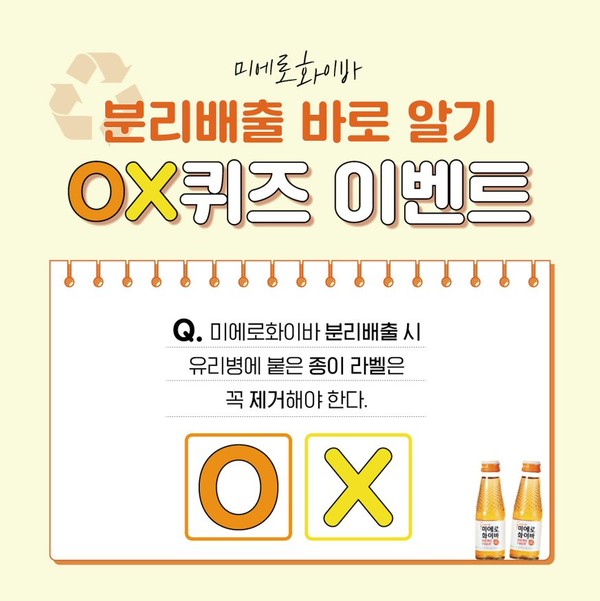 이벤트에 참여하려면 미에로화이바 공식 SNS 페이지의 해당 게시글에서 분리배출에 관한 OX퀴즈를 풀고 댓글로 정답을 작성하면 된다. 추첨을 통해 총 10명에게 미에로화이바 350ml 제품 1박스를 증정한다. 당첨자는 오는 28일 미에로화이바 SNS 채널을 통해 발표될 예정이다.