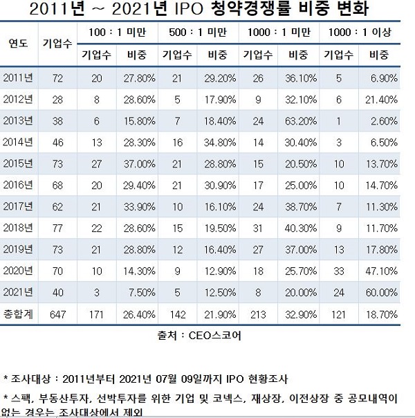 14일 기업평가사이트 CEO스코어(대표 박재권)가 2011년부터 올해 상반기까지 IPO를 진행한 647개 상장사의 청약경쟁률과 공모금액, 청약증거금 등 IPO 현황을 조사한 결과, 상장사 평균 청약경쟁률은 2011년 438.7대 1에서 올해 6월 1376.9대 1로 10여년간 3배 증가한 것으로 집계됐다.