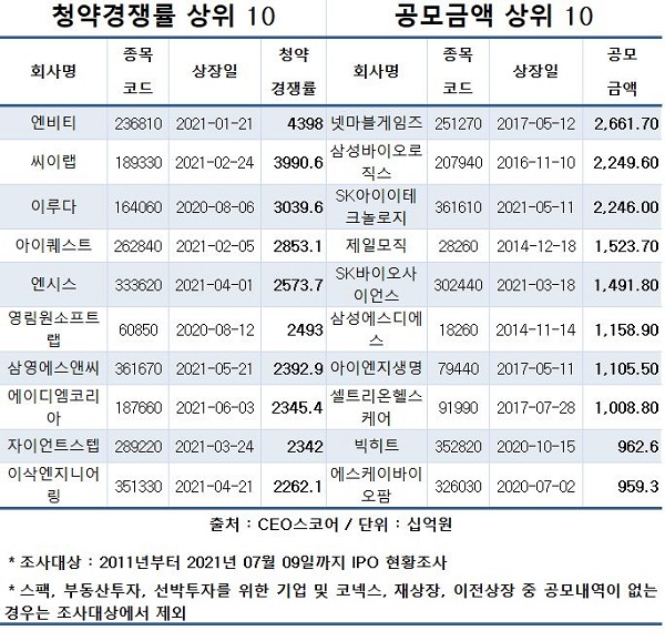 조사기간 중 청약증거금이 가장 많이 모인 기업은 제일모직이다. 2014년 12월 18일 상장한 제일모직은 당시 공모가격 5만3000원에 485조2210억 원의 청약증거금이 모였다. 이어 2014년 11월 14일 상장한 삼성SDS가 484조3648억 원(공모가격 19만 원)으로 2위를 기록했고, SK아이이테크놀로지(162조6453억 원, 공모가격 10만5000원), SK바이오사이언스(128조3519억 원, 공모가격 6만5000원), 빅히트(117조6174억 원, 공모가격 13만5000원)도 ‘톱5’에 이름을 올렸다.