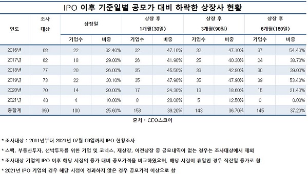 한편, 2016년부터 올해 6월까지 IPO를 진행한 390개 상장사 중 100곳(25.6%)은 상장일 당일 종가가 공모가액보다 낮았던 것으로 나타났다. 또 상장 후 1개월째에는 153곳(39.2%)이, 3개월째에는 143곳(36.7%)이, 6개월째에는 145곳(37.2%)의 종가가 공모가격에 미치지 못한 것으로 집계됐다. 상장 후 6개월이 지난 시점에서 상장기업의 3분의 1이 넘는 기업의 주가가 공모가 밑으로 떨어진 것이다.