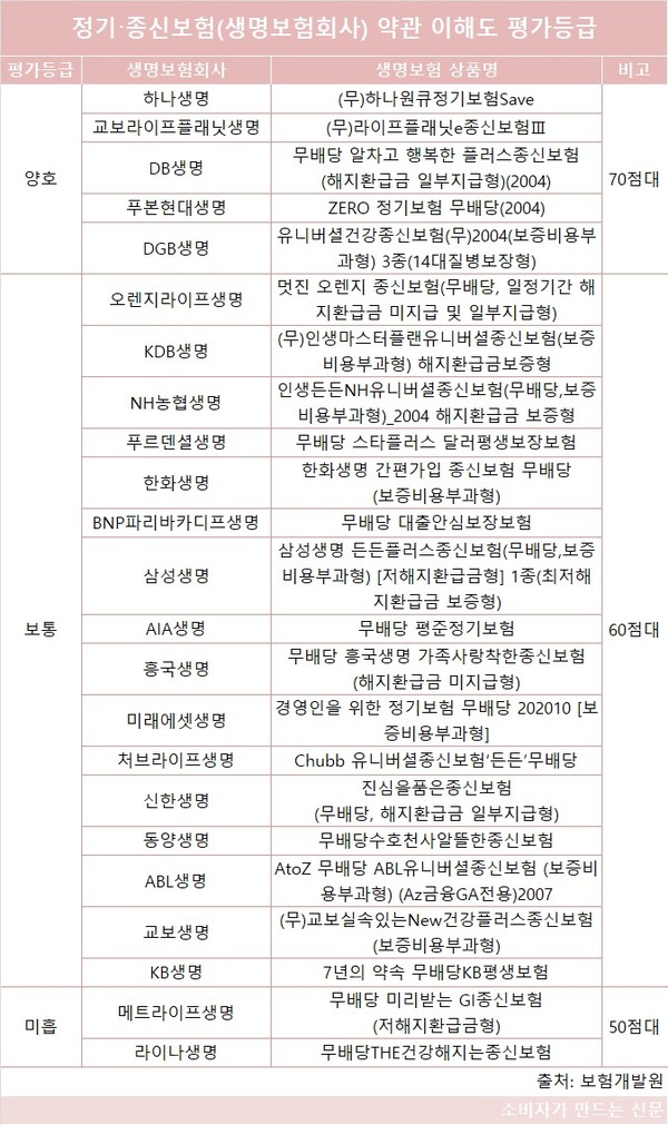 보험개발원의 평과 결과 23개 생명보험사는 평가위원 평가(100점 만점)에서 평균 61.9점, 일반인 평가(30점 만점)에서는 평균 23.9점을 획득했다. 두 가지 평가결과를 종합한 정기·종신보험의 최종 점수는 67.2점으로 보통 등급을 받았다.