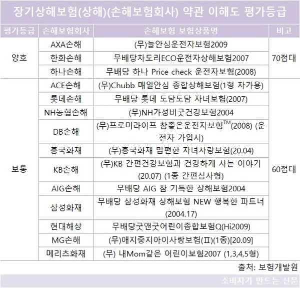 손해보험은 총 14개의 보험상품 중 AXA손해보험, 한화손해보험, 하나손해보험 등 3개사가 양호등급을 받았으며 나머지 11개사는 보통등급으로 평가됐다.