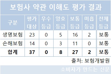 보험개발원의 ‘제21차 약관 이해도 평가’에서 평가대상 보험사 37개사 중 78.4%에 달하는 29개사가 ‘보통’ 이하의 평가를 받았다. 양호 등급은 8개에 그쳤으며 최고 등급인 ‘우수’는 단 한곳도 없었다.