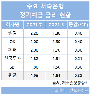 뒤이어 OK저축은행과 페퍼저축은행이 2.00% 금리를 제공하며 5월 1.60%, 1.70% 대비 각각 0.40%포인트, 0.30%포인트 증가했다.