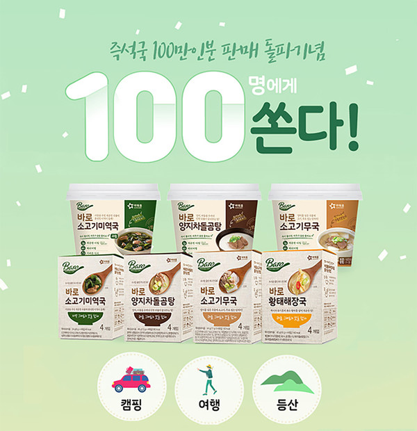 아워홈은 소비자 호응을 기념한 이벤트를 선보인다. 오는 31일까지 아워홈 식품점몰에서 바로 즉석국을 구매 후 '아워홈', '물만부어바로먹는', '바로즉석국' 등의 해시태그와 함께 본인 계정 인스타그램에 리뷰를 남기면 추첨을 통해 선물을 증정한다. 당첨자 발표는 8월 9일 개별 연락한다.
