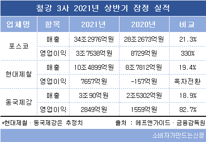 현대제철 역시 상반기 7657억 원의 영업이익을 기록하며 전년동기 영업손실 157억 원에서 흑자 전환할 것으로 예상된다. 동국제강은 전년동기 영업이익 1559억 원보다 82.7% 증가한 2849억 원을 기록할 전망이다.