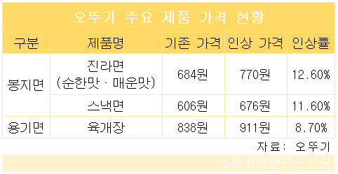 ▲진라면(순한맛·매운맛)은 684원에서 770원으로 12.6% ▲스낵면은 606원에서 676원으로 11.6% ▲육개장(용기면)은 838원에서 911원으로 8.7% 인상된다.