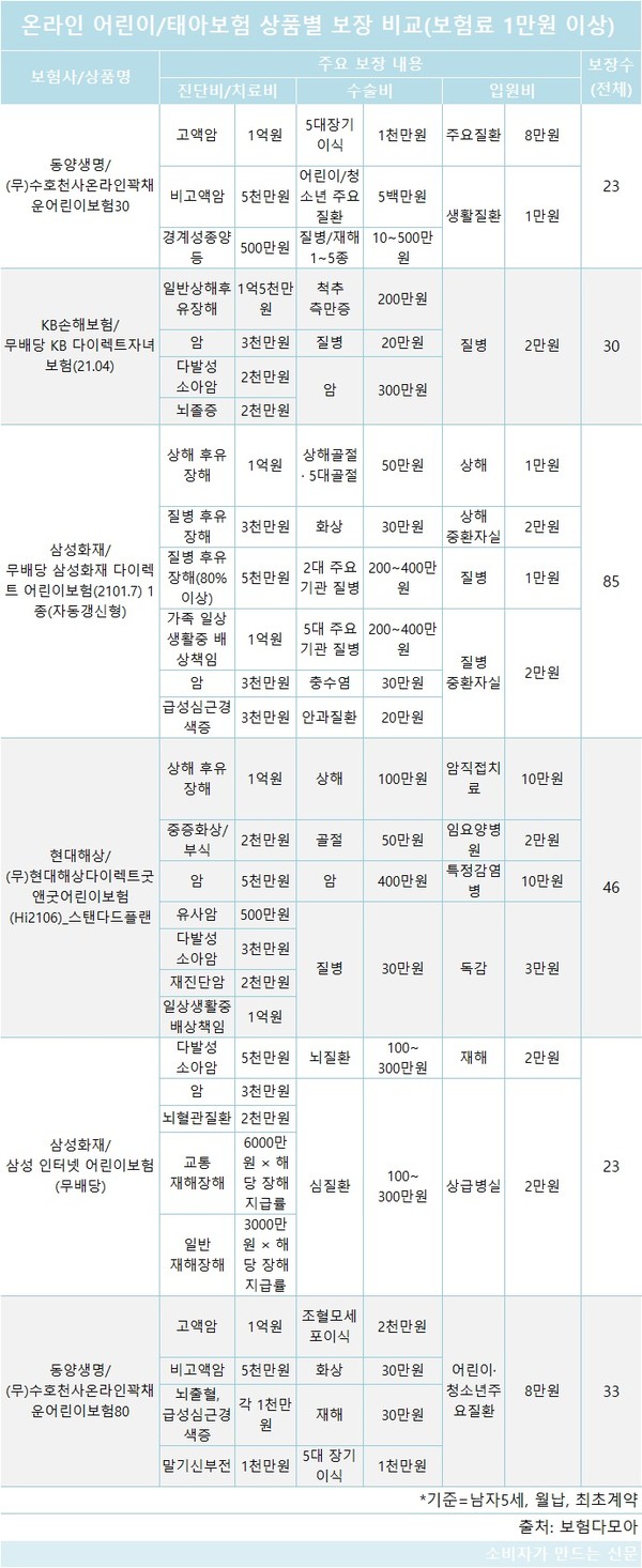 업계 관계자는 “보험료 뿐 아니라 보장 범위와 질병 진단금, 수술비 등 조건이 천차만별인 만큼 자녀와 가족의 라이프스타일과 원하는 목적에 맞춰 꼼꼼히 상품을 선택하는 것이 중요하다”고 조언했다.