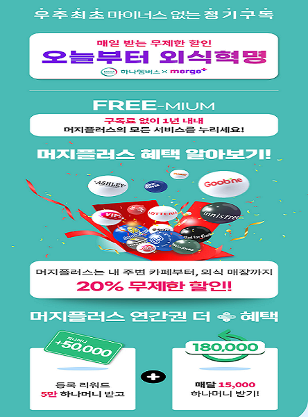 특히 머지플러스 연간권을 18만 원에 일시 구매하면 1차로 8월 13일에 5만 하나머니를 지급하며 추가로 매월 말일에 1만5000 하나머니씩 12개월 동안 총 18만 하나머니를 지급한다. 이 외에도 12개월 동안 제휴 가맹점에서 상시 20% 할인혜택도 받을 수 있다.