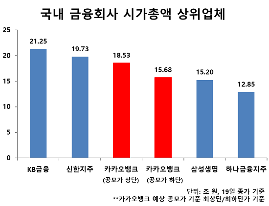 19일 종가기준 국내 주요 금융지주사 시총이 KB금융(21조1646억 원), 신한지주(19조7599억 원), 하나금융지주(12조8954억 원) 순으로 카카오뱅크가 예상 공모가 밴드로 상장 확정시 국내 시총 3위 금융회사가 된다.
