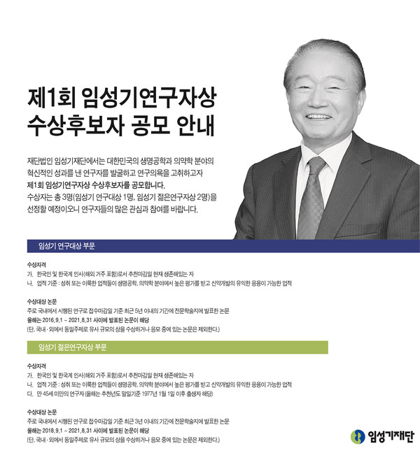 한미약품그룹 창업주 고(故) 임성기 회장의 철학과 유지를 받들기 위해 설립된 임성기재단(이사장 이관순)은 생명공학과 의약학 분야에서 혁신 성과를 내고 신약개발에 기여한 연구자들을 발굴 시상하는 '제1회 임성기 연구자상' 공모에 많은 추천과 응모를 바란다고 20일 밝혔다.