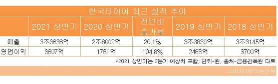 22일 금융정보업체 에프앤가이드에 따르면 한국타이어는 상반기 매출 3조3636억, 영업이익 3607억 원이 전망된다. 전년 동기 대비 매출은 20.1%, 영업이익은 무려 104.1%가 중가하는 수치다.