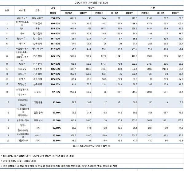 21일 기업평가사이트 CEO스코어(대표 박재권)가 금융감독원 전자공시시스템에 감사보고서를 제출하고 2017년과 지난해 매출 및 자산을 비교할 수 있는 1만1524개 기업을 대상으로 ‘고속성장기업 100곳’을 선정한 결과, 유통과 생활용품, 서비스업종을 중심으로 코로나19의 수혜를 입은 업종이 대거 포함된 것으로 조사됐다.