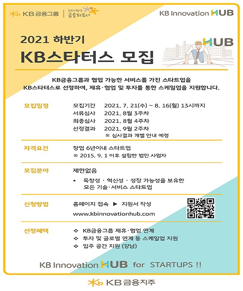 2021년 하반기 KB스타터스 공개모집 참가신청은 8월 16일까지이며 참여방법 및 프로그램에 대한 자세한 내용은 KB이노베이션허브 공식 웹사이트를 통해 확인할 수 있다.