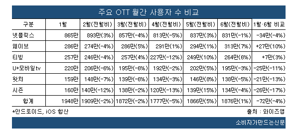 애플리케이션 분석 기업 와이즈앱에 따르면 올해 상반기 주요 OTT 서비스의 이용자 수는 1월 1948만 명에서 6월 1875만 명으로 4% 가량 줄었다.