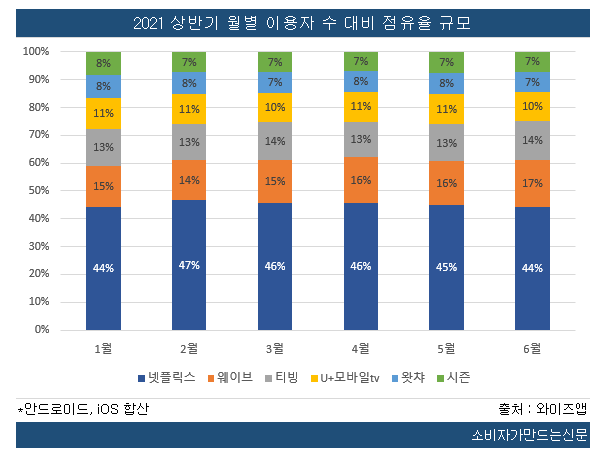 반면 업계 2위를 차지하고 있는 웨이브는 상반기 이용자수가 크게 증가했다. 1월 286만 명에서 시작해 2월 274만 명으로 줄었다 3월부터 286만 명, 4월 291만 명, 5월 294만 명, 6월엔 313만 명으로 증가했다. 1월 대비 10% 증가한 27만 명이 늘었다.