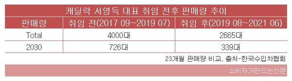 한국수입차협회에 따르면 캐딜락은 서영득 대표가 취임한 2019년 8월부터 최근까지 23개월(2019년 8월~2021년 7월)간 판매량이 2665대에 그쳤다. 서 대표 취임 이전 23개월(2017년 9월~2019년 7월) 동안 4000대가 팔린 것에 비해 33.3%나 줄어든 수치다.