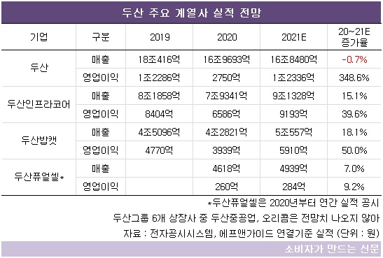 구조조정과 수소분야로의 사업 재편에 나선 두산은 올해 실적이 턴어라운드 될 전망이다.