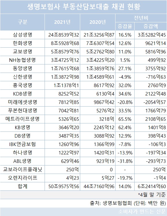 생명보험협회에 따르면 지난 4월말 기준 생보업계의 부동산담보대출 채권 총액은 50조9576억 원으로 집계됐다. 이는 지난해 같은 달(44조7161억 원) 대비 14%(6조2415억 원) 증가한 수치다.