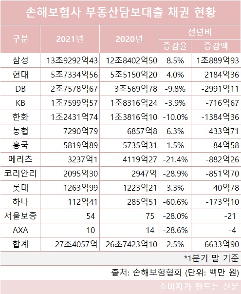 손해보험사 역시 지난해 6월말 기준 26조4859억 원까지 하락했던 부동산담보대출 잔액은 지난해 하반기부터 상승세로 돌아서며 올해 1분기에 27조4057억 원으로 늘어났다. 전년 1분기 대비 2.5%(6634억 원) 증가한 규모다.