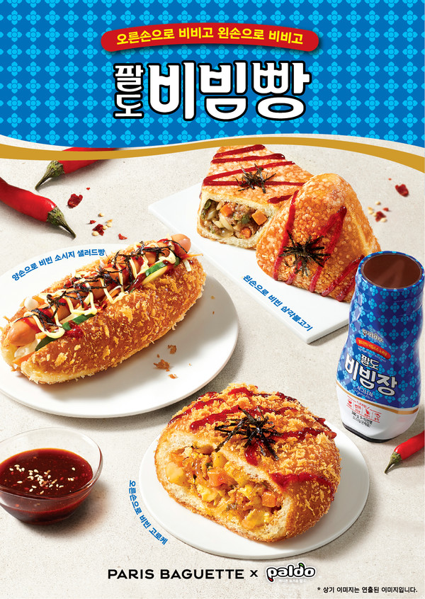 콜라보 제품은 △오른손으로 비빈 고로케 △왼손으로 비빈 삼각불고기 △양손으로 비빈 소시지 샐러드 3종이다. 누구나 아는 비빔면 CM송을 제품명에 적용했다. 야채, 소시지, 고기 등의 주재료와 바삭하게 튀겨진 빵에 비빔소스가 어우러진다. 시그니처 마크인 파란색 꽃무늬 패턴 위에 제품명이 새겨진 패키지는 팔도비빔면을 연상케 한다.