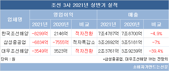 조선 3사의 영업손실은 매출이 감소하는 가운데 원자재가 인상 등 악재가 겹친 탓이다.