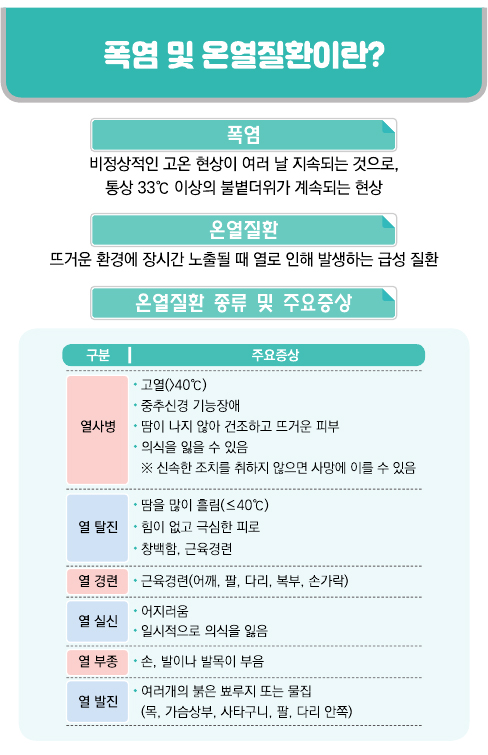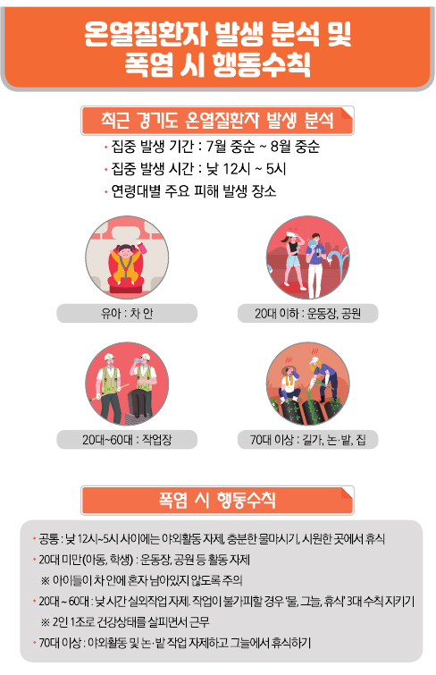 도는 폭염 시 건설현장 등 야외 근로자 보호를 위해 무더위 휴식시간(14:00~17:00) 준수를 지자체 홈페이지, 전광판, 마을방송 등을 통해 적극 홍보하고 예찰 활동을 강화토록 할 계획이다.