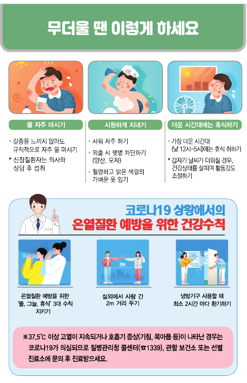 코로나19와 관련해서는 현재 운영중인 무더위 쉼터, 폭염저감시설에 대해 거리두기, 마스크 쓰기, 출입자명부 작성 여부 등 방역 실태를 폭염대책기간 중 현장 점검 시 집중 점검할 계획이다.