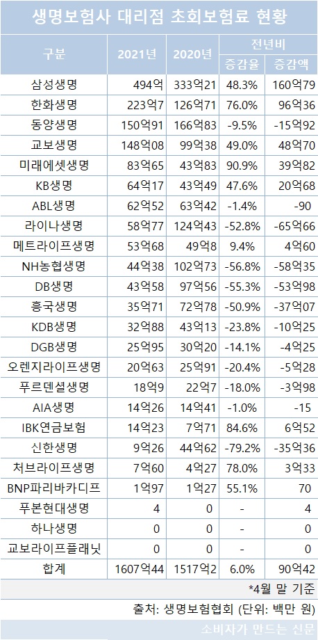 한화생명(대표 여승주)의 올해 4월 대리점 초회보험료는 223억 원으로 지난해 127억 원 대비 76% 증가했다. 미래에셋생명(대표 변재상·김평규) 역시 작년 매출 44억 원에서 올해 84억 원으로 91% 늘었다.