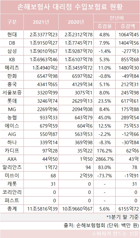 이밖에 대리점 보험료 규모 2위인 DB손해보험(대표 김정남)은 전년 대비 1405억 원 증가한 1조9150억 원의 대리점 수입보험료 실적을 기록했으며, 메리츠화재(대표 김용범)는 전체 손해보험사 중 가장 많은 1480억 원의 대리점 수입보험료 증가액을 기록했다. DB손해보험, 메리츠화재 역시 판매자회사를 운영하고 있다.