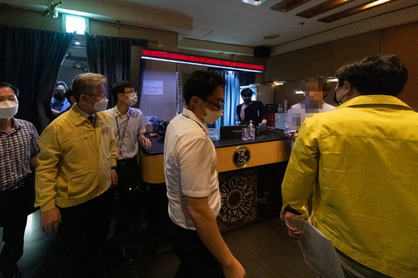 이재명 경기도지사는 22일 오후 10시경 안양시에 위치한 한 유흥주점을 불시 점검하고 현장에서 함께 술을 마시던 여성접객원과 손님 등 7명을 적발했다.