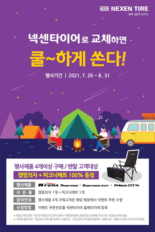 26일부터 8월까지 행사 제품 4개를 구매 및 렌탈하는 고객에게 ‘캠핑 의자와 피크닉 매트’로 교환 할 수 있는 쿠폰을 증정한다. 쿠폰 번호를 넥센타이어 홈페이지 내 이벤트 페이지에 입력하면 주소지로 사은품이 배송된다.