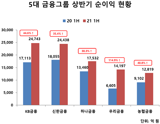 올해 상반기 5대 금융지주의 총 순이익은 전년 대비 45.7% 증가한 9조3729억 원을 기록하며 반기 기준 역대 최대 순이익을 달성했다.