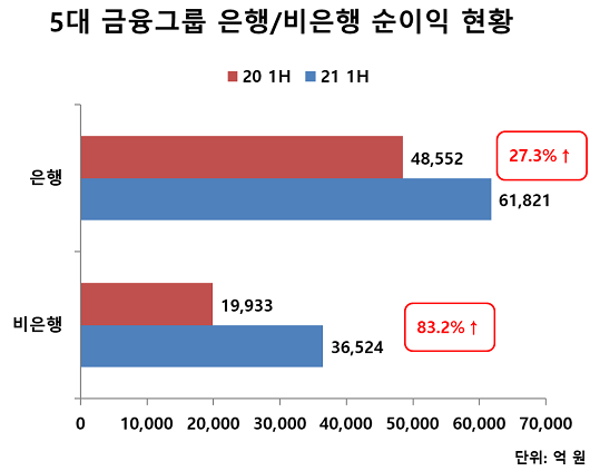 5대 금융지주 은행 계열사들의 상반기 순이익은 전년 대비 27.3% 증가한 6조1821억 원이었고 비은행 계열사 순이익은 같은 기간 83.2% 증가한 3조6524억 원을 기록했다. 증가액과 증가율 모두 비은행 계열사가 압도적으로 앞섰다.