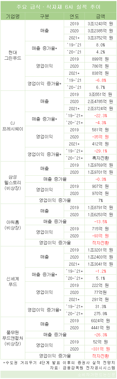 증권가 실적 추정치에 따르면 급식·식자재 6사 가운데 상장 기업인 CJ프레시웨이(대표 정성필)와 현대그린푸드(대표 박홍진), 신세계푸드(대표 송현석)의 올해 예상 총매출은 전년에 비해 1.4% 늘어난 7조517억 원, 예상 총영업이익은 86.2% 급증한 1541억 원이다.