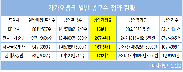 카카오뱅크의 공모주 청약은 6월 20일부터 시행된 자본시장법 시행령 개정안에 따라 처음으로 중복 및 이중청약이 제한됐다. 증권사별 경쟁률은 KB증권 168대 1, 한국투자증권 207대1, 하나금융투자 167대 1, 현대차증권 178대 1이다.
