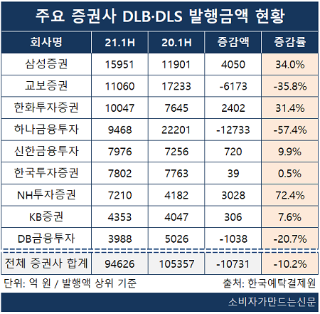 10일 한국예탁결제원 증권정보포털에 따르면 올해 상반기에 국내 증권사가 발행한 DLB·DLS 총액은 9조4626억 원으로 지난해 같은 기간 10조5357억 원보다 1조731억 원(10.2%) 감소했다.