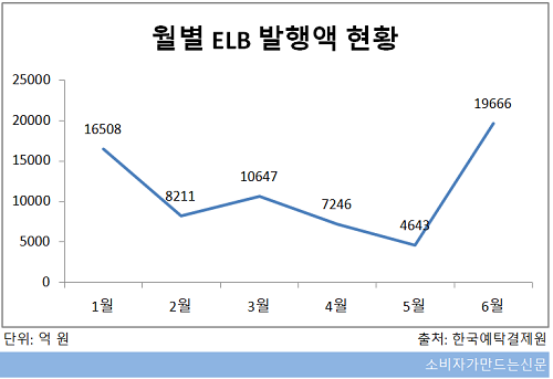 6일 금융투자협회에 따르면 공모기준 증권사의 ELB 발행 잔액은 지난 6월 말 기준 1조9666억 원으로 전달(4643억 원)에 비해 네 배 이상 급증했다.