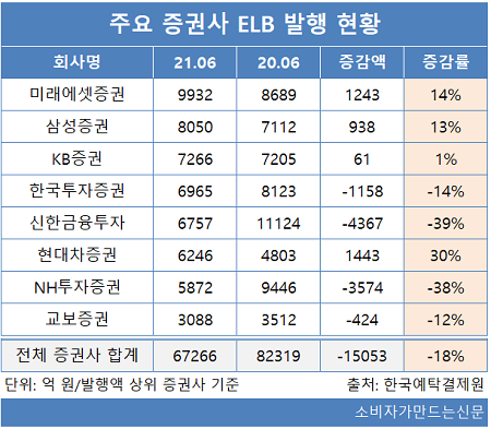 다만 전체 상반기 발행잔액을 집계했을 때 지난해 대비 감소한 것으로 나타났다. 한국예탁결제원에 따르면 올해 상반기 주요 증권사가 발행한 전체 ELB 잔액은 6조7266억 원으로 전년 동기 8조2319억 원 대비 1조5053억 원(18%) 줄어들었다.